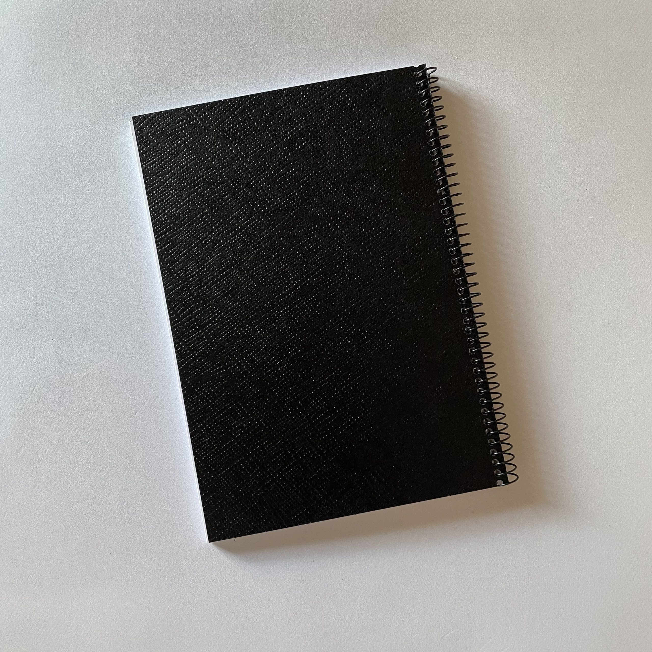 Libreta con portada en papel fotográfico con plástico protector y trasera en cartón rígido.